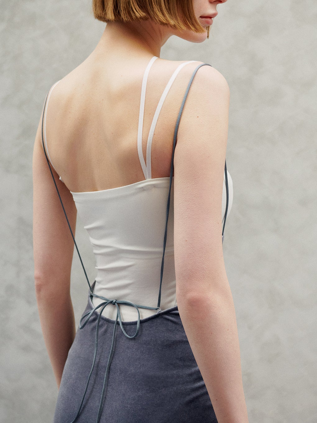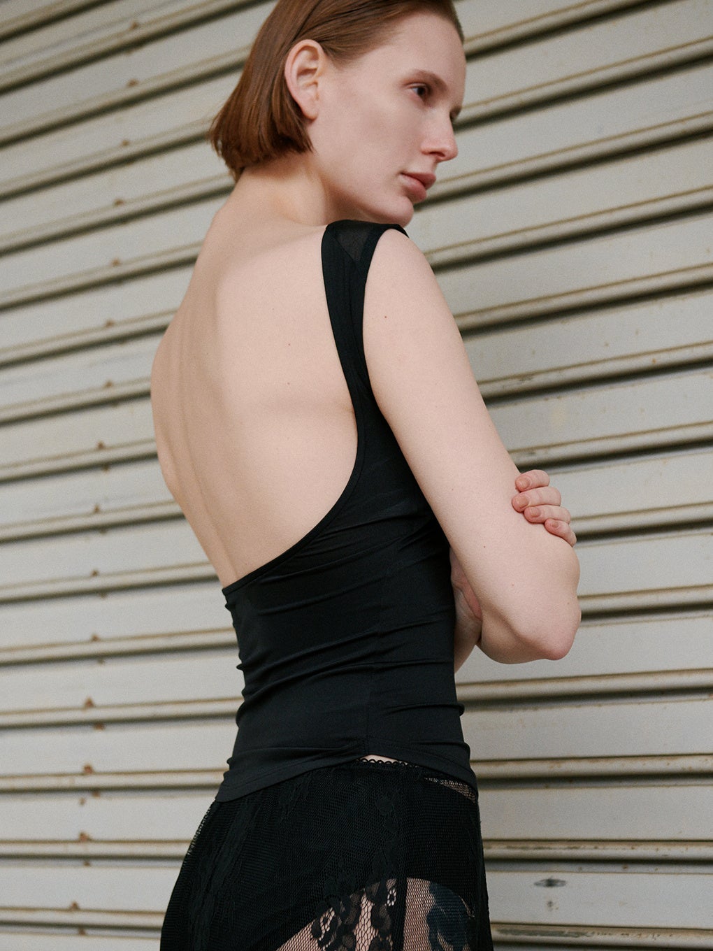 背中を大きく開けたデザインが特長の、カップ付きタンクトップインナー。