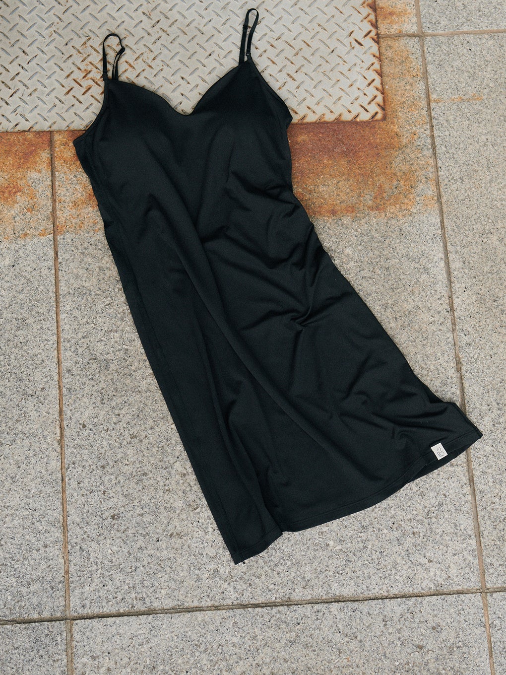 背中を大きく開けたデザインが特長の、カップ付きキャミソールドレスインナー。バックオープンのアイテムにも対応できるよう、背中の開きを深く設計しました。