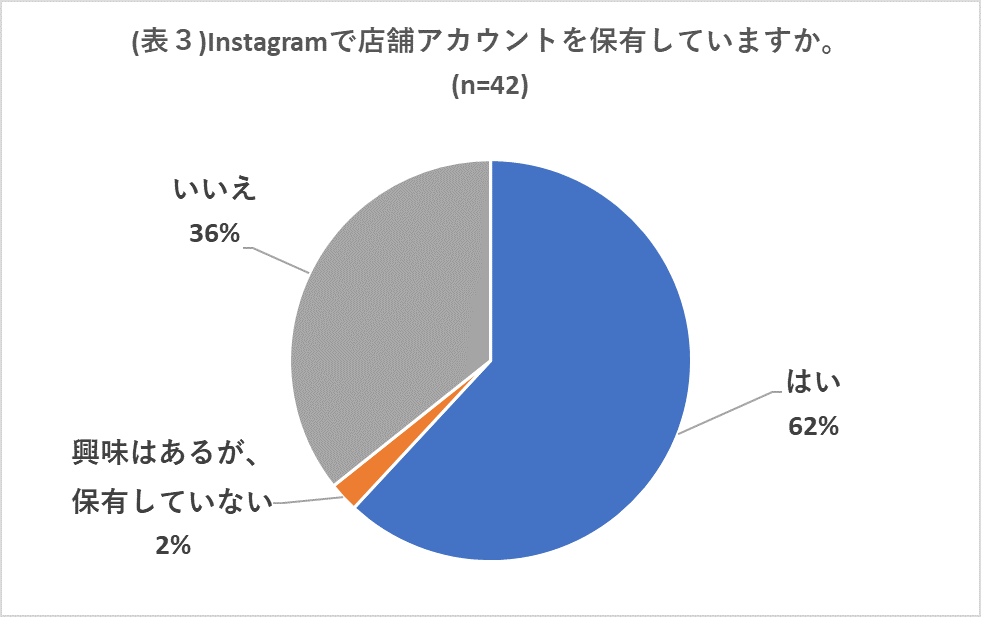 また、店舗のInstagramアカウント保有有無(表3)に関しては、約60%以上が保有しており、飲食店でのInstagramアカウント利用率の高さが伺えます。