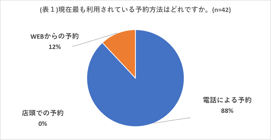 JCBの調査では、予約方法で最も利用されている方法(表1)は「WEBからの予約」が12%、WEB 予約台帳サービスの利用有無(表2)では14%の利用に留まるという結果でした。