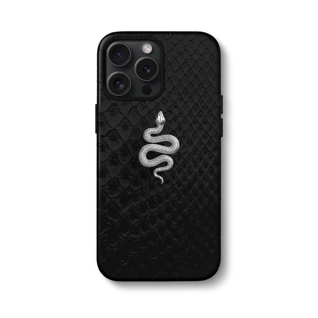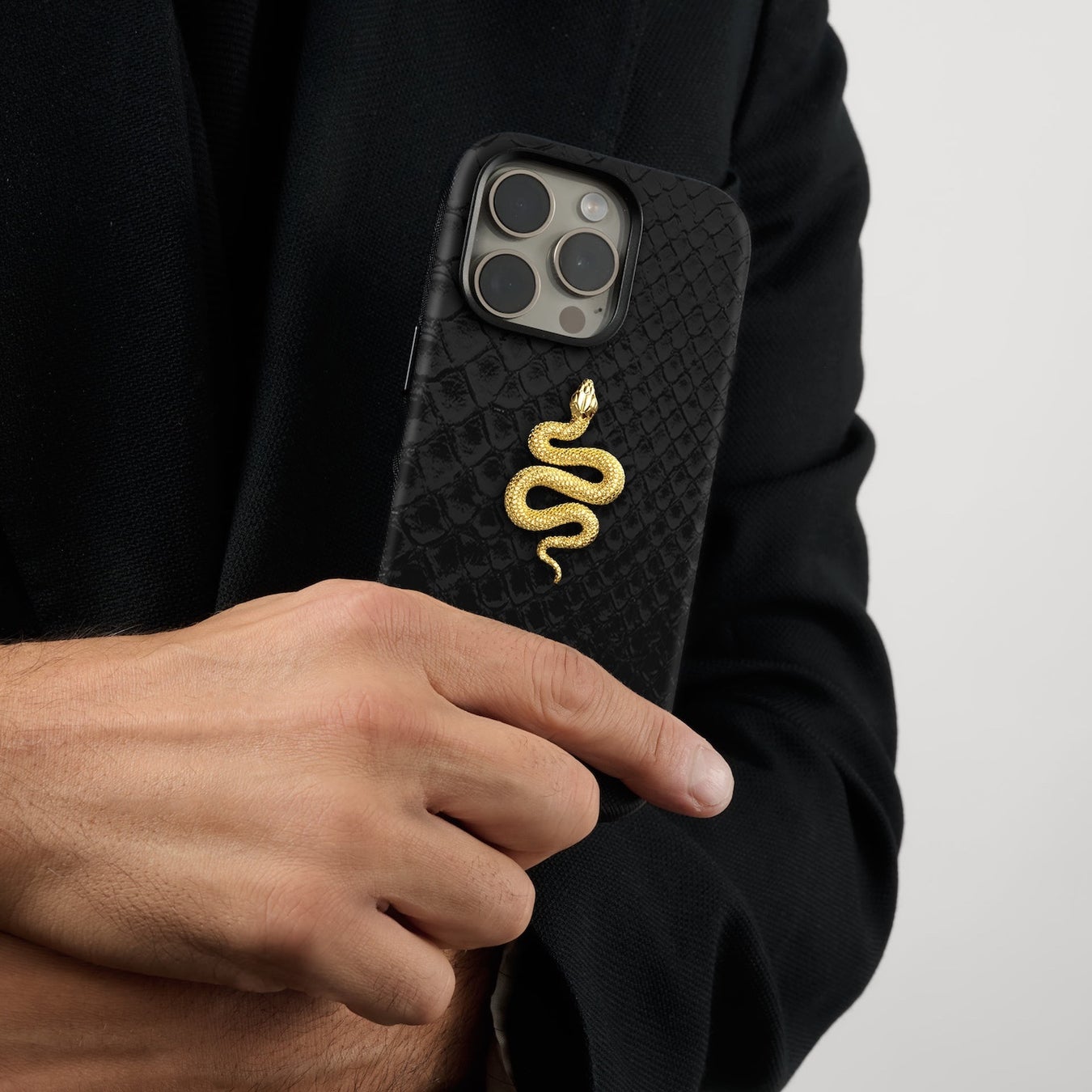手作業で仕上げられた蛇のエンブレムは、職人の技術が光るディテールまで緻密に施されており、その仕上がりはまるでジュエリーのような輝きを放ちます。パイソンレザーが持つ独自の質感と蛇のエンブレムが一体となり、デバイスに個性的でエレガントな魅力を加えます。