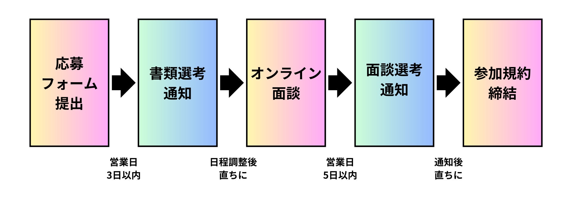 プログラムの支援期間は、1期あたり6ヶ月間で、1年半の間に全4期開催予定です。応募フォームご提出後、書類選考とオンラインでの面談選考を経て、可能な限りスピーディに支援を開始します。