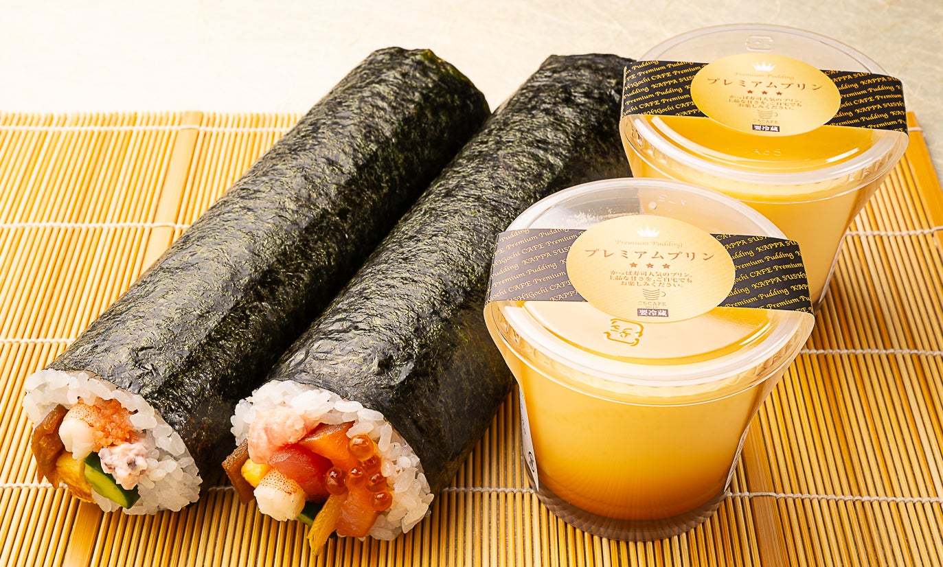 おこさまから大人まで楽しめる『特選恵方巻』と人気海鮮ネタを含む『豪華10種 海鮮恵方巻』の2本に、かっぱ寿司大人気スイーツ『プレミアムプリン』のお持ち帰り用2個をセットにしました。
