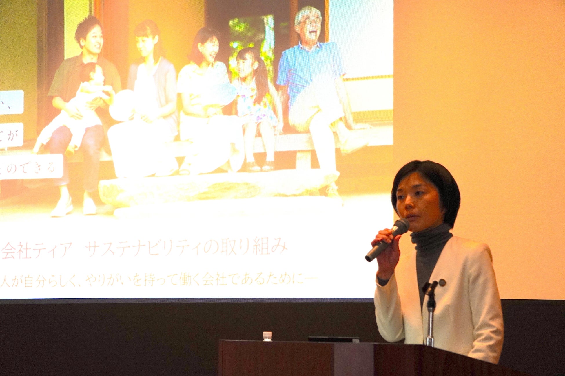 株式会社ティアESG本部 加藤本部長の講演では、同社の具体的な女性の活躍推進の取り組みについて言及し、従業員のキャリアデザイン形成への支援や、定期的な座談会の開催による様々な分野で働く女性の情報共有の場を創出することで、女性が働きやすい環境を整えていることを紹介しました。