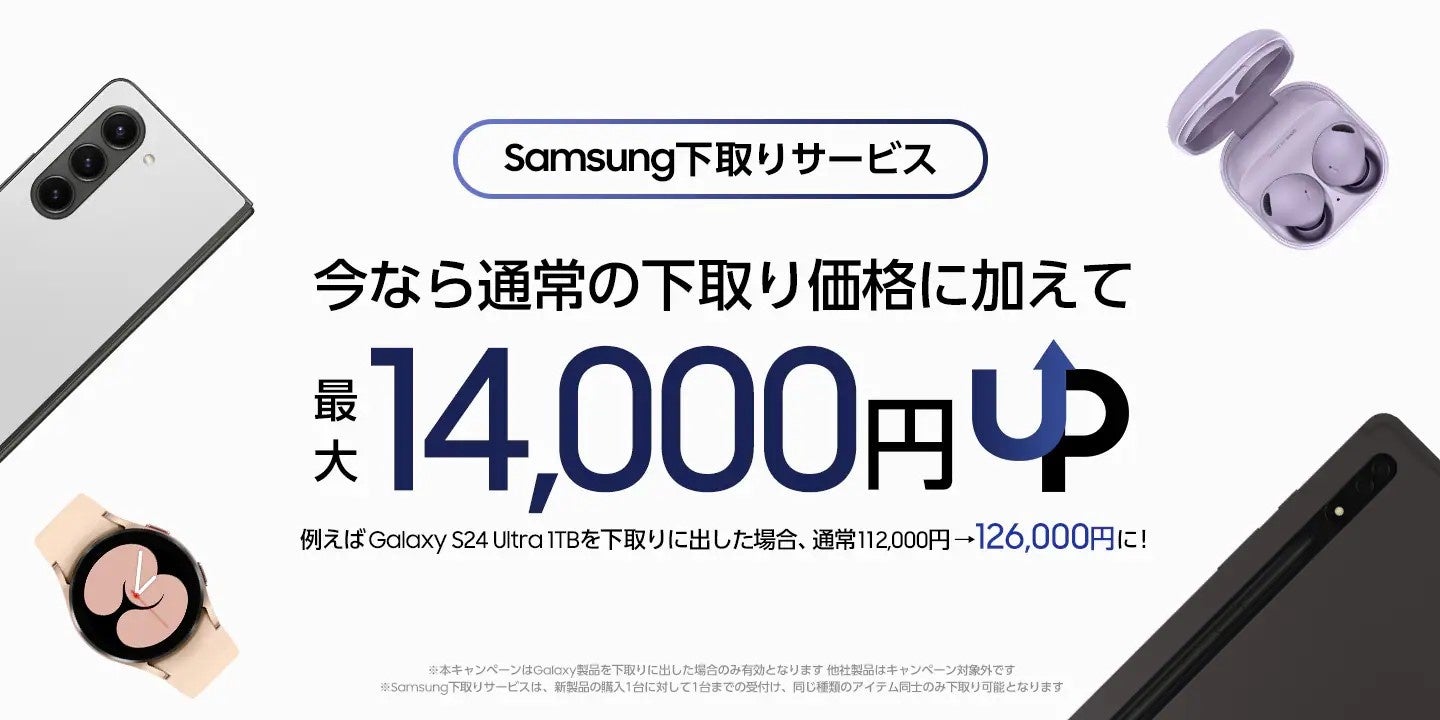期間中、現在お持ちのGalaxy製品の下取りをお申込みいただきましたお客様に、通常の下取り価格から最大14,000円を増額する下取りサービス増額キャンペーンを2024年9月27日(金)~2024年10月31日(木)まで実施しております。本キャンペーンをご利用いただくことで、最新のSamsung 製品をより気軽にお得にお楽しみいただけます。