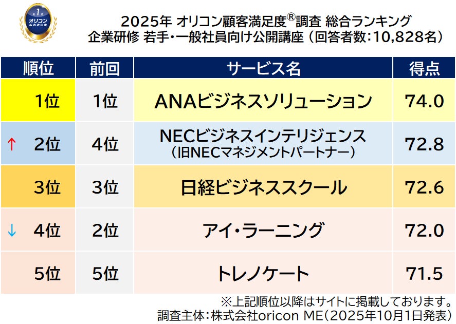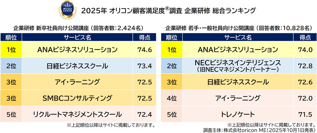 満足度の高い企業研修ランキング【ANAビジネスソリューション】が初の総合2冠 『企業研修 新卒社員向け公開講座』【ANAビジネスソリューション】が7年ぶり2度目の総合1位(オリコン顧客満足度®調査)