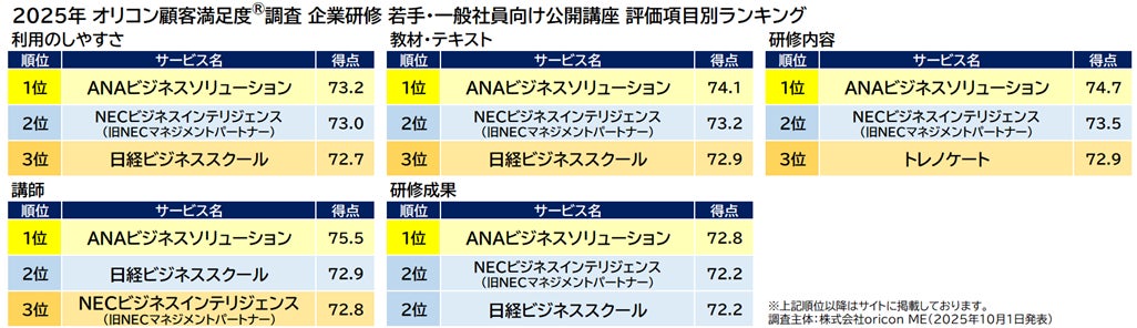 オリコン株式会社(本社:東京都港区 代表取締役社長:小池 恒、略称:オリコン)は、グループ会社である株式会社oricon MEが、実際のサービス利用者を対象に第三者の立場で実施した『企業研修 新卒社員向け公開講座』『企業研修 若手・一般社員向け公開講座』についての顧客満足度調査の結果を、2025年10月1日(水)14時に「オリコン顧客満足度®」公式サイト内にて発表いたしました。ランキングは以下の通りとなりました。