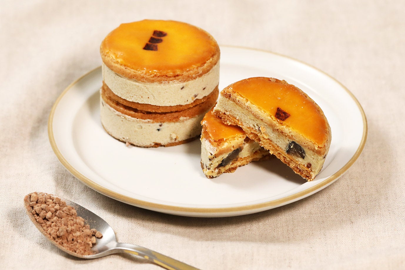 - 北海道産小麦およびフランス産発酵バターを使用したサブレに、ほうじ茶と黒豆のバタークリームをサンドいたしました。