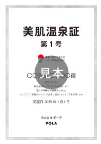 ポーラはウェルビーイングによる社会貢献の実現を目指しており、その活動の一つとして、日本各地の温泉の魅力を、長年に渡り研究を続けてきた肌サイエンスの力で明らかにする「温泉プロデュース」に取り組んでおります。対象の温泉の実際に浸かる浴槽のお湯について肌への作用を科学的に分析し、美肌作用が解明できた温泉に[ポーラ美肌温泉証]を認定しております。