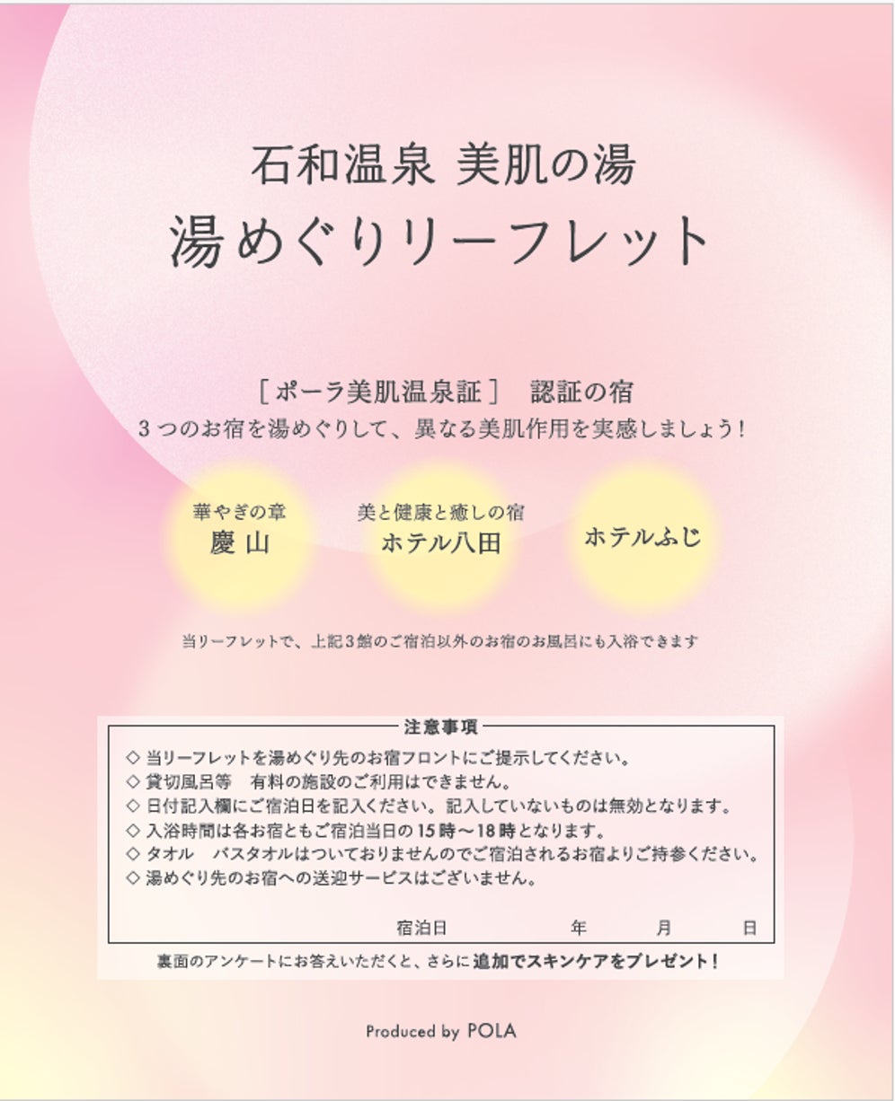 「石和温泉 美肌の湯 湯めぐり」が特典として提供される宿泊プランをご購入のお客様には、専用のリーフレットとポーラのブライトニングブランド「ホワイティシモ」のスキンケアキットをセットにしてプレゼントいたします。
