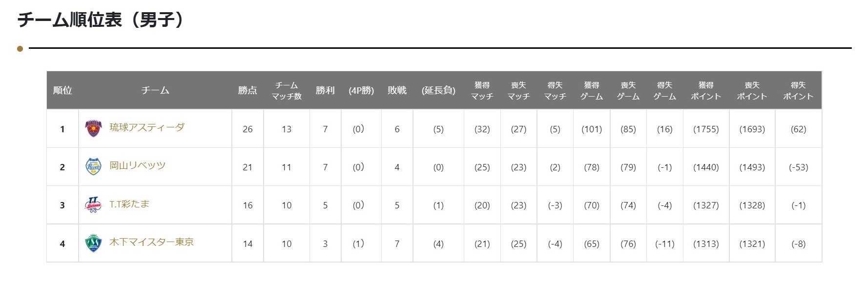 笠岡開催2日間(岡山リベッツホーム開催)、初日土曜日、2位T.T彩たまと3位岡山リベッツの対戦は、第1マッチ、第2マッチと連続出場した岡山・イ サンスがいずれも勝利。シングルス1位のハオ シュアイも第4マッチを制し、3-1で勝利し岡山は2位に浮上した。翌日日曜日は1位琉球アスティーダと前日2位に浮上した岡山。どちらも譲らず、ビクトリーマッチまでもつれた勝負は、岡山・ハオ、琉球・吉村真と、現在シングルス勝利数1位、2位のふたりの対決。これを制した岡山が、3位→2位、そして首位との差を縮めるホーム開催2連勝となった。