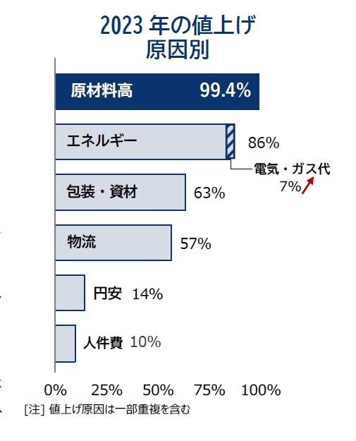 2023年に予定される値上げ約2万5000品目のうち、原材料高が理由となるものは99%以上(品目数ベース)と、ほぼ全てで原材料高が理由にあげられた。一方、足元では電気・ガス代上昇に伴う値上げの割合が7%(5月末:6%)に拡大し、エネルギー価格高騰による影響が広がっている。