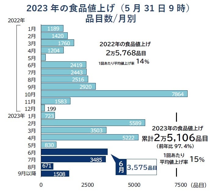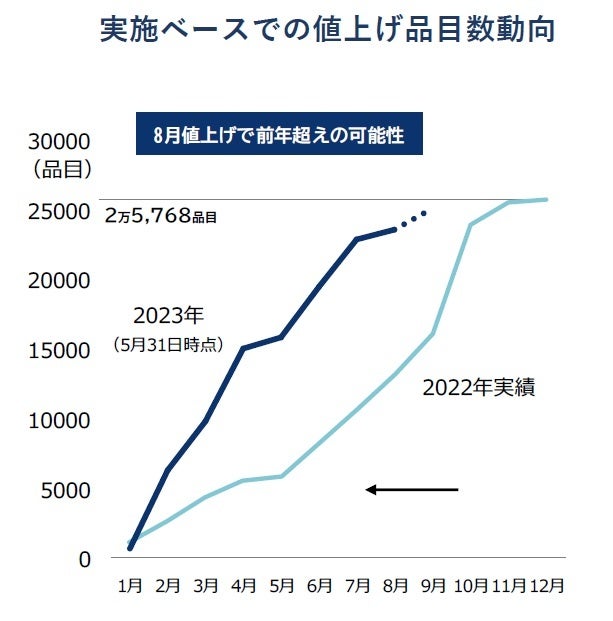 2023年における家庭用を中心とした飲食料品の値上げ品目数は、5月31日までの判明ベースで累計2万5106品目に上った。昨年以降、調査対象195社のうち9割超の企業で1回以上の値上げが行われた。また、前年に実施された値上げ累計品目数(2万5768品目)からは97.4%の水準に達した。