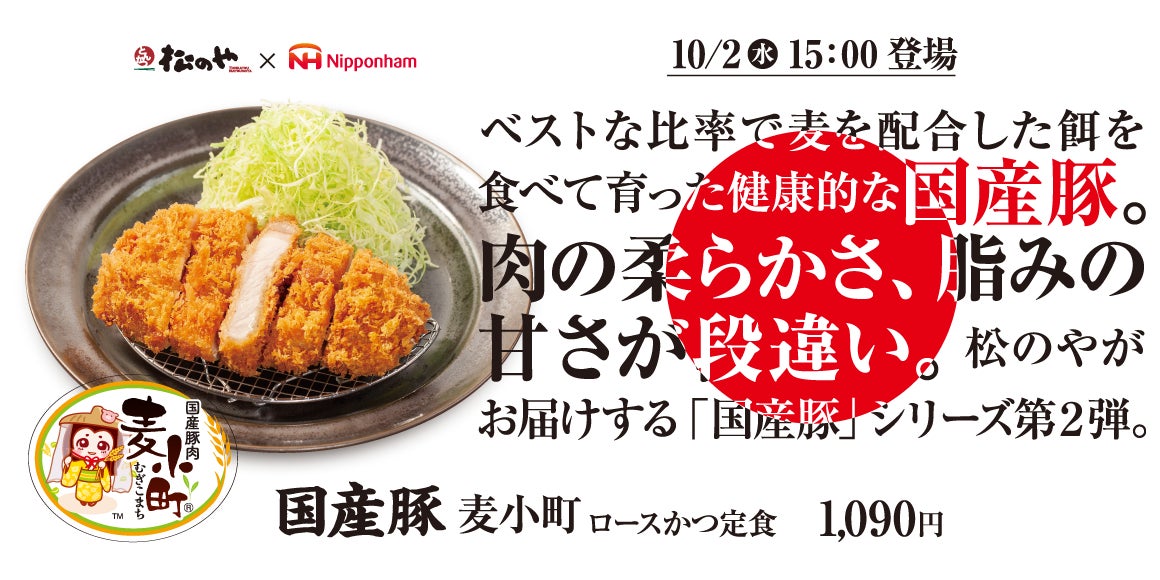 株式会社松屋フーズ(本社:東京都武蔵野市、代表取締役社長:瓦葺 一利)では、とんかつ専門店の「松のや」におきまして、2024年10月2日(水)午後3時より、「国産豚 麦小町ロースかつ」を発売いたします。