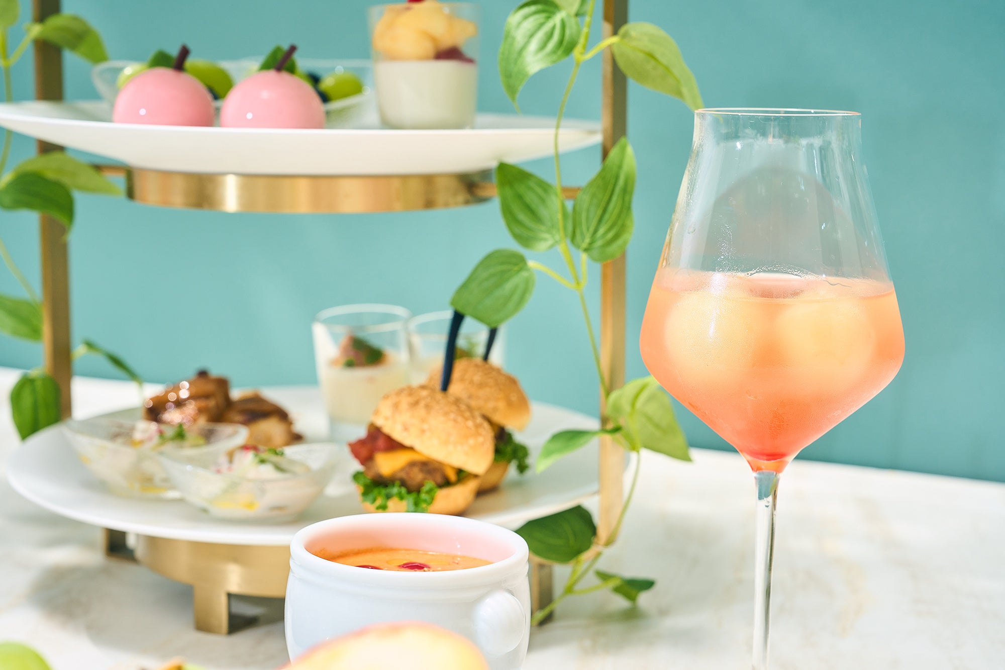 スイーツはフレッシュな桃をお楽しみいただけるタルトやパンナコッタ、桃をかたどったキュートでアイコニックなムース、みずみずしさを噛みしめるシャインマスカットそのものや、輝くシャインマスカットのシャンパンゼリーなど7種類がラインナップ。セイボリーは、生ハムと合わせた白桃のブランマンジェやシャインマスカットのホワイトマリネ、TAVERN特製の旨味が凝縮されたミニバーガー、スパイシーチキンなど4種に加え、桃を入れたアールグレイ香るサラダや、赤パプリカの冷製ポタージュなど、シェフが腕を振るう充実の内容でお届け。