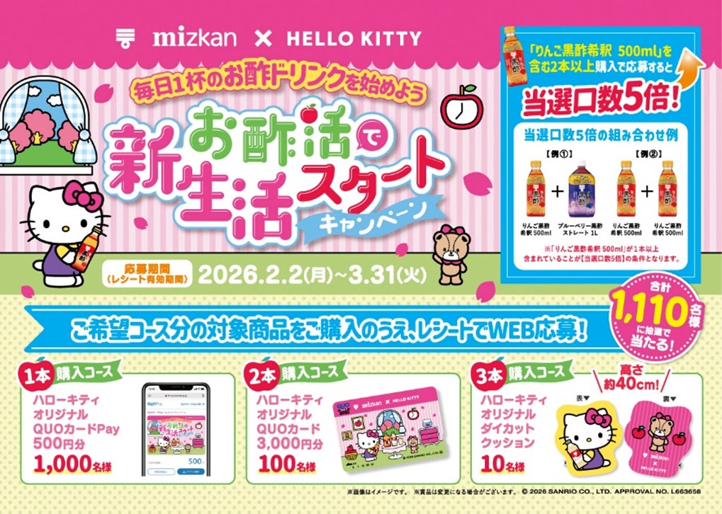 株式会社Mizkan(本社:愛知県半田市、代表取締役社長兼CEO:吉永 智征、以下:ミツカン)は、大人気キャラクター『ハローキティ』とのコラボレーション企画第2弾となる「お酢活で新生活スタートキャンペーン」を、2026年2月2日(月)より開催いたします。本キャンペーンでは、期間中に対象の黒酢飲料を購入し、WEBからご応募いただいた方の中から、ハローキティオリジナルQUOカードやQUOカードPay、オリジナルダイカットクッションなど、限定コラボグッズが抽選で合計1,110名様に当たります。