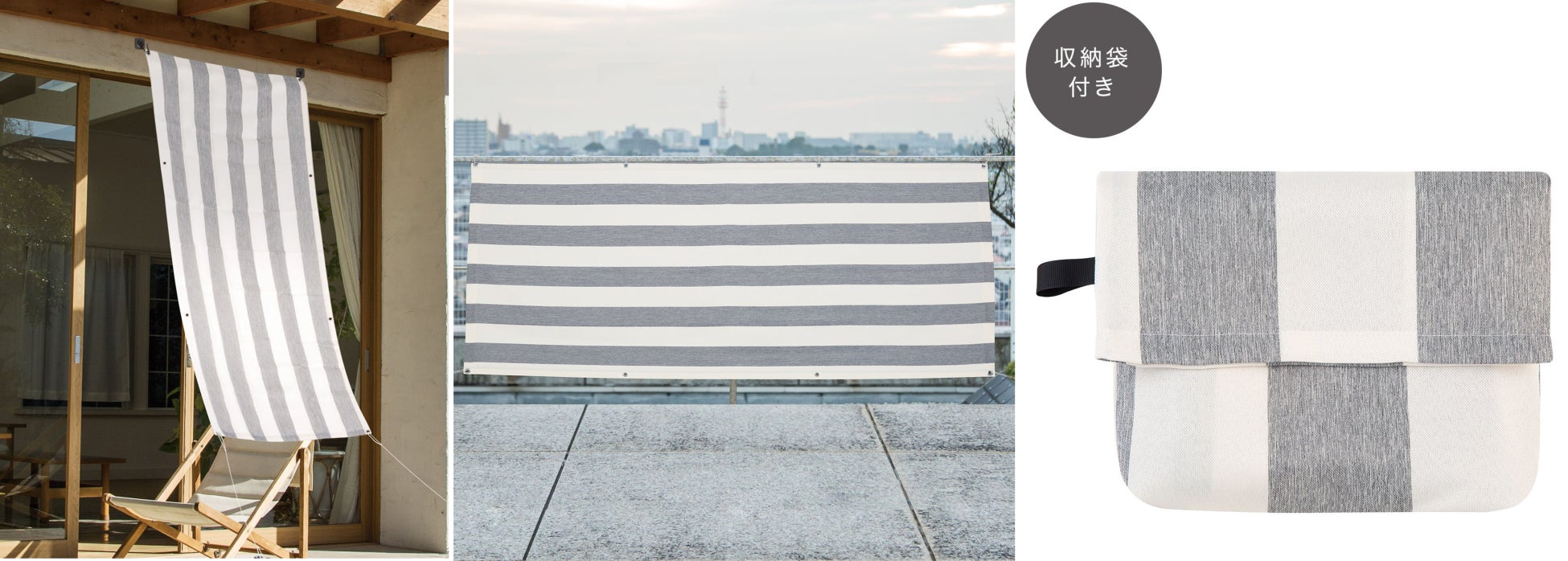 屋外用では、「白とグレーのストライプが爽やかで、夏にぴったり」「撥水加工だから雨の日でも使える」と大変ご好評頂きました撥水加工付きの「日除けシェード」を、今年も販売いたします。