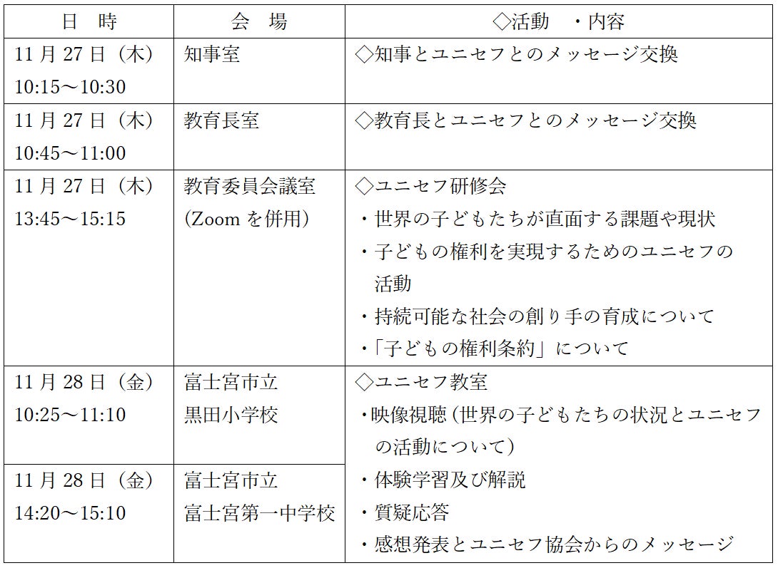 ユニセフと知事・教育長とのメッセージ交換、ユニセフ研修会、小・中学校でのユニセフ教室を実施します。