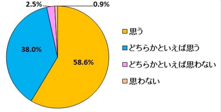 今後の物価高騰の見通しについて「続くと思いますか」との問いには「思う」が58.6%、「どちらかといえば思う」の38.0%を合わせると9割を超えており、家計への悪影響が今後も続くと心配している人が大半を占めていることがわかります。