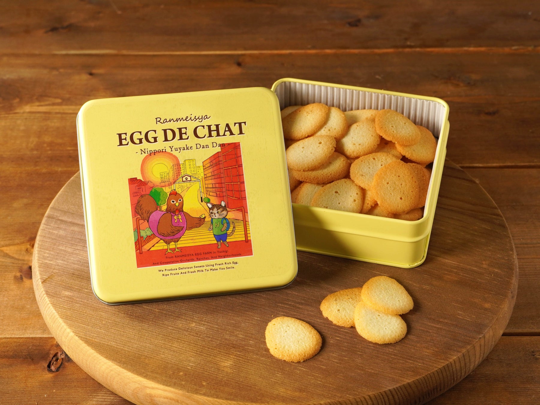 ラングドシャは、卵でさらにおいしくなる。起泡性の高い卵白がかなえるサクッとした軽快な食感と、お口でほろりとくずれる繊細なくちどけ。日暮里の街並みを描いた限定デザイン缶です。