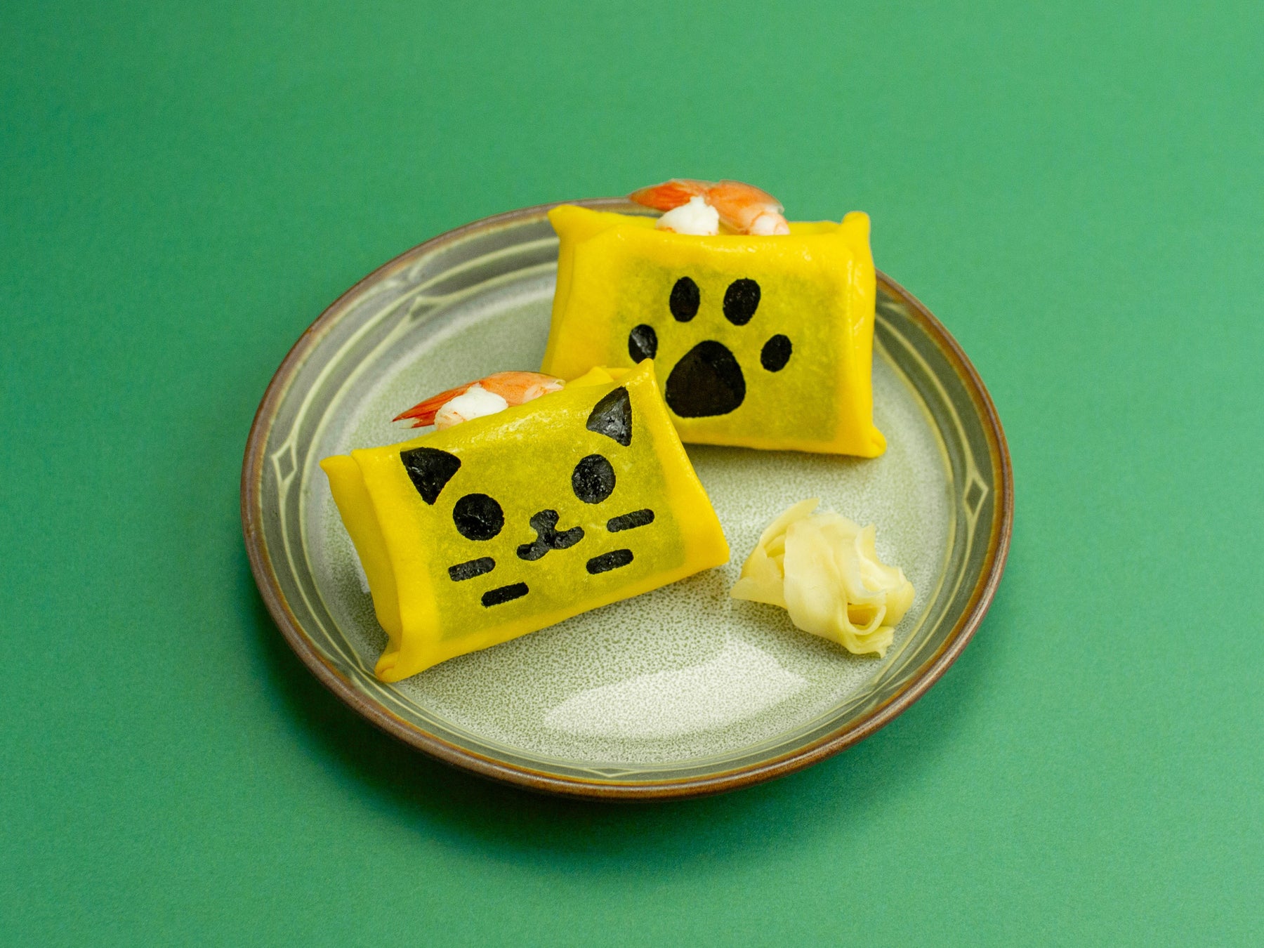 干ぴょう、椎茸、焼き穴子、きくらげ、柚子を細かく刻んで白ゴマ、刻みのりが入った混ぜご飯をねこ柄の錦糸玉子で包みました。日暮里らしい猫のモチーフをあしらっています。