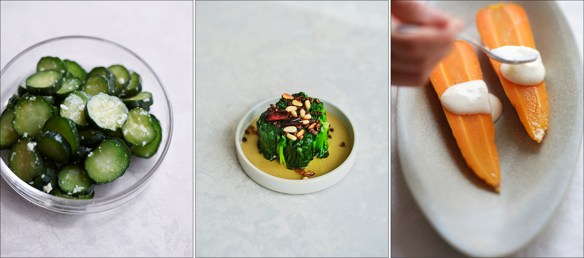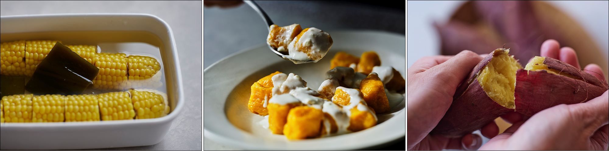 春(レシピ)野菜のだし浸し/春にんじんとマンゴーのラペ/新玉ねぎの春巻き/春の豆のスープ…(エッセイ)「春の台所」「辻和金網の蒸し網」など… 夏(レシピ)トマトのサラダ/カリカリ塩麹きゅうり/ゴーヤのごま酢和え/とうもろこしの塩水漬け(エッセイ)「父を思い出すル・クルーゼ鍋」「アンティークの器」など… 秋(レシピ)なすのフムス/エリンギの味噌バター焼きなど…(エッセイ)「〝かす〟じゃない、酒粕のこと」「しいたけは嫌い、ではない」など… 冬(レシピ)春菊と海苔のサラダ/ほうれん草の花椒オイルがけ/シャキシャキねぎの鶏団子スープ/発酵白菜など…(エッセイ)「祖母の味」「思い出の大根鍋」など…。