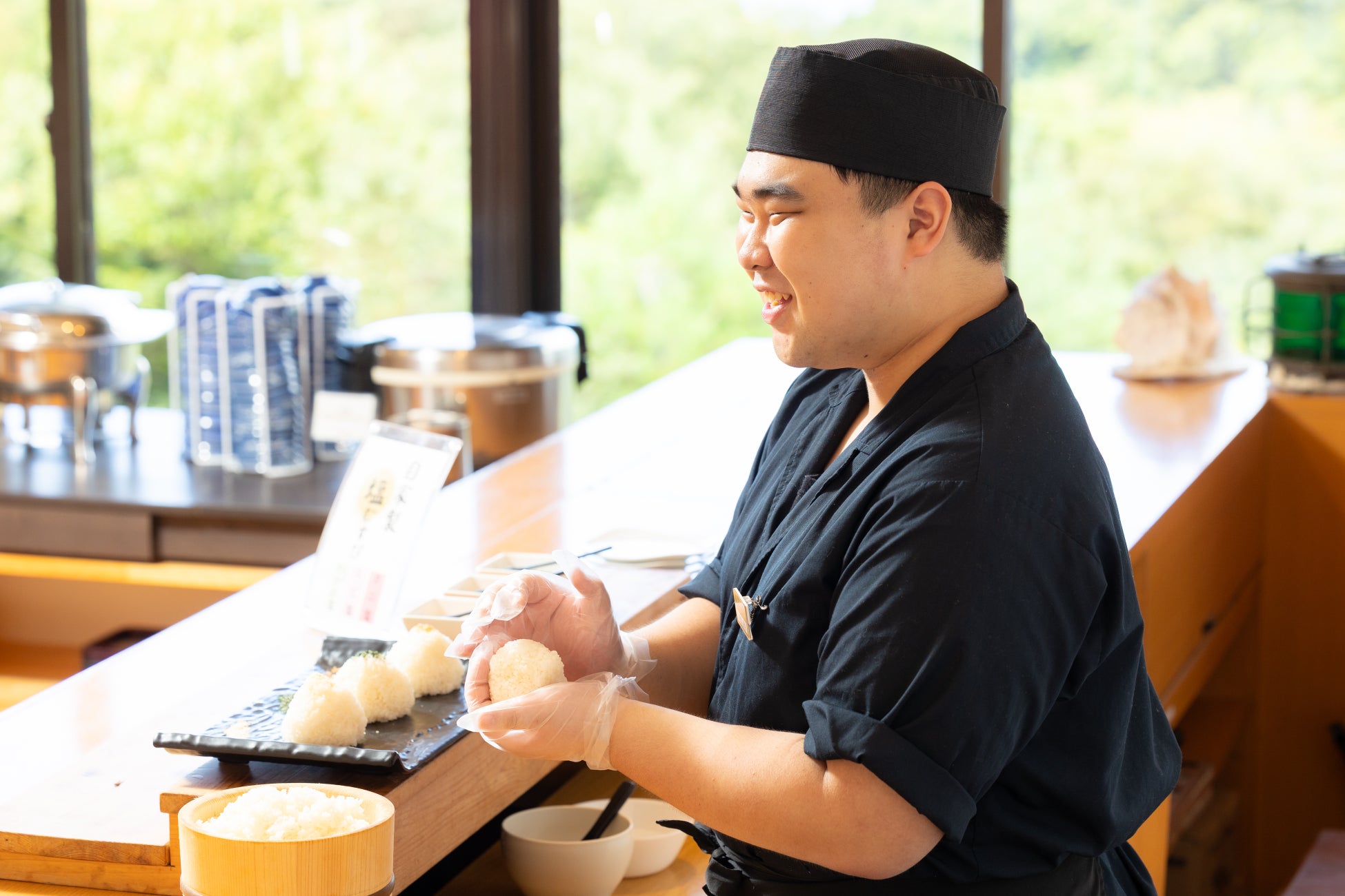 ◆朝食ビュッフェではオリジナル塩シリーズをアツアツおにぎりでご提供中。