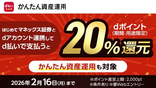 株式会社NTTドコモ(以下、ドコモ)は、マネックス証券株式会社(以下、マネックス証券)の証券総合取引口座と「dアカウント®」をはじめて連携すると、「d払い®」でのお買物金額の20%分のdポイントを還元する「d払い20%還元!マネックス証券口座とのdアカウント連携キャンペーン 第2弾」を、2025年12月1日(月)から2026年2月16日(月)まで開催します。