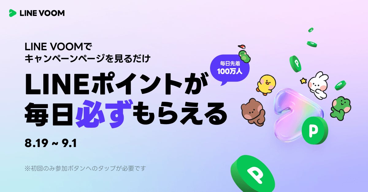 LINEヤフー株式会社は、「LINE」内のショート動画プラットフォーム「LINE VOOM」にて、2024年8月19日(月)より、毎日先着100万人にLINEポイントをプレゼントするキャンペーンを開催します。