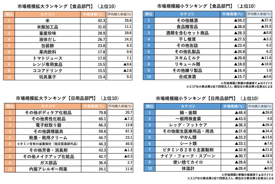 株式会社マクロミル(本社:東京都港区、代表執行役社長 CEO:佐々木徹 以下、当社)は、当社の消費者購買履歴データ「QPR™」をもとに、2024年下半期の「食品」と「日用品」のカテゴリ別購入金額の伸びから振り返る「2024年下半期市場規模拡大・縮小ランキング」を発表しました。