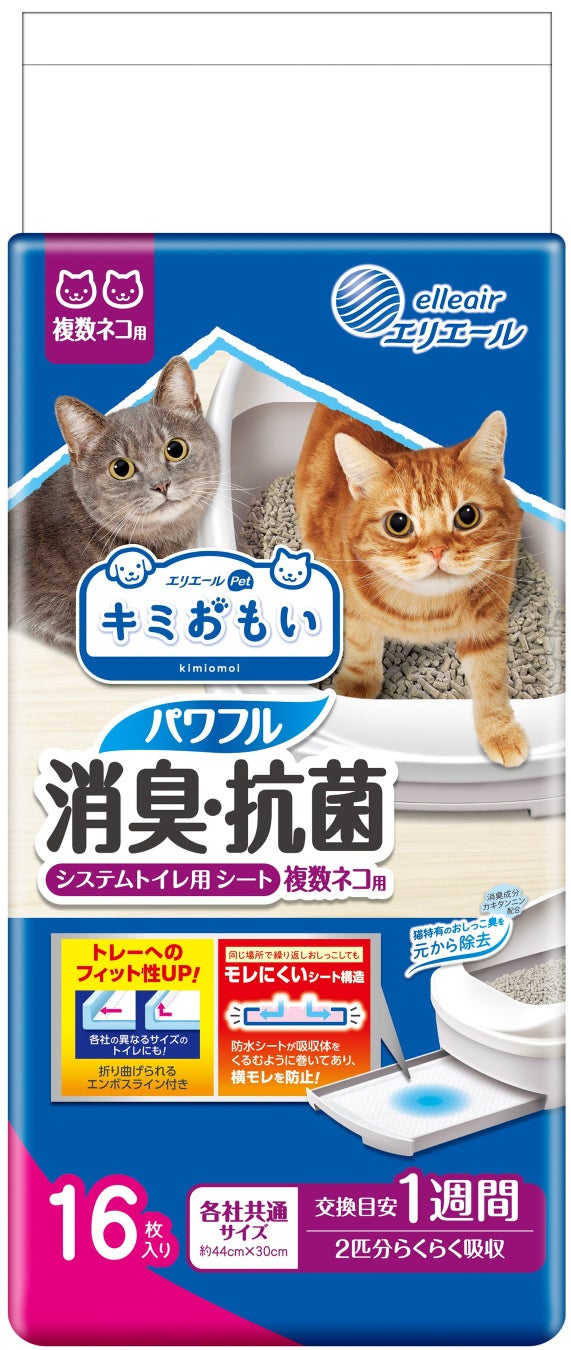 そこで今回、日本初の技術※1を採用した消臭効果4倍※2と1ヶ月継続する消臭力を実現した『キミおもい パワフル消臭・抗菌 システムトイレ用ネコ砂』と、ネコちゃん特有のトイレ臭を元から除去する消臭成分を配合し、各社システムトイレにぴったりフィットして端モレもブロックする『キミおもい パワフル消臭・抗菌 システムトイレ用シート』を発売します。システムトイレのユーザーが求める消臭力を実現するとともに、ネコちゃんにとっても快適なトイレ環境を実現します。