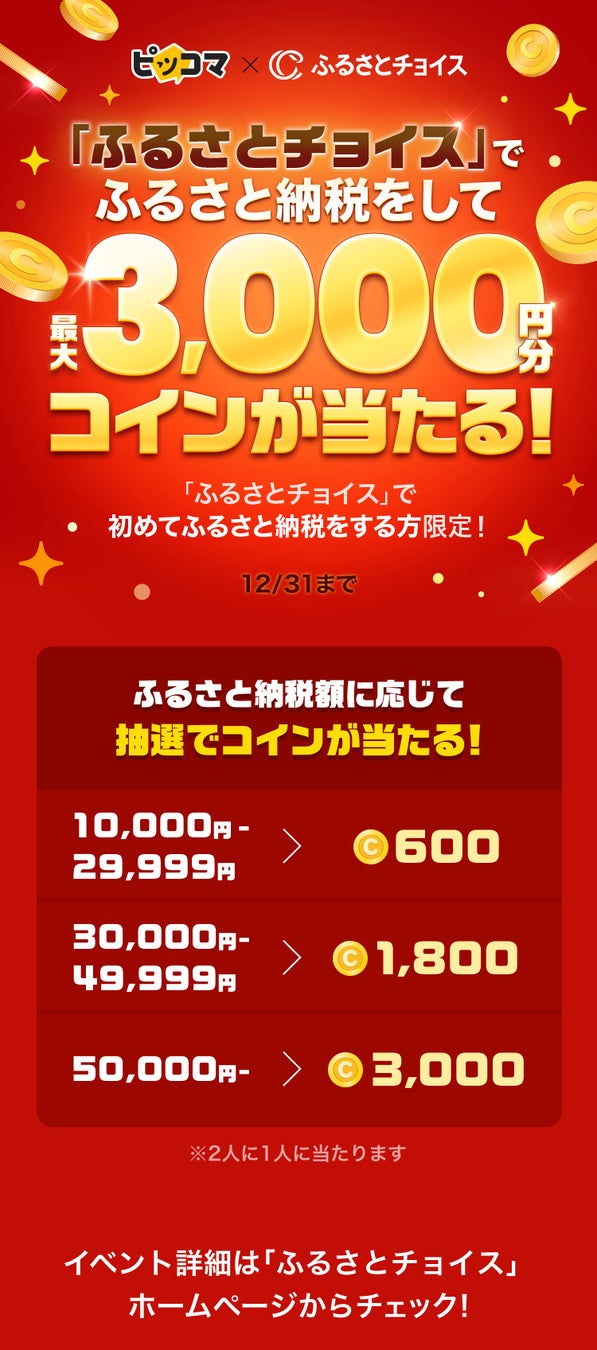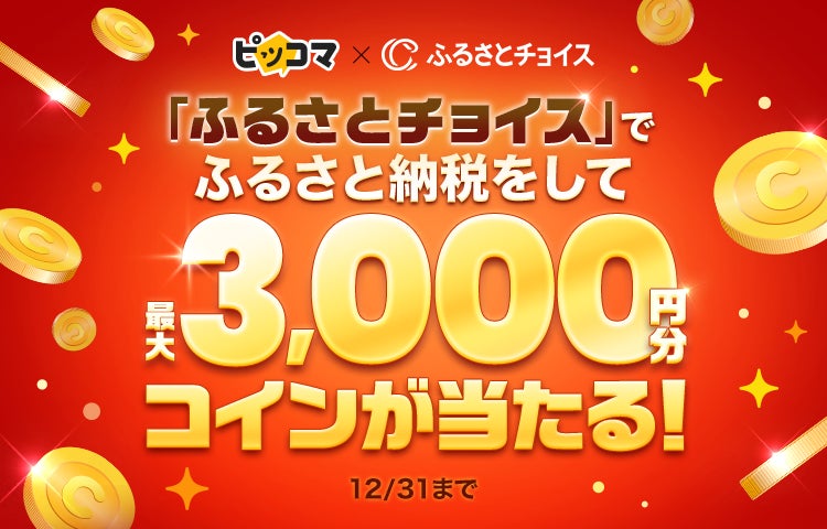 ピッコマ、11/21(木)から12/31(火)まで、日本最大級のふるさと納税総合サイト「ふるさとチョイス」にて、抽選で最大3,000円分のコインが当たるチャンスのキャンペーンを実施。