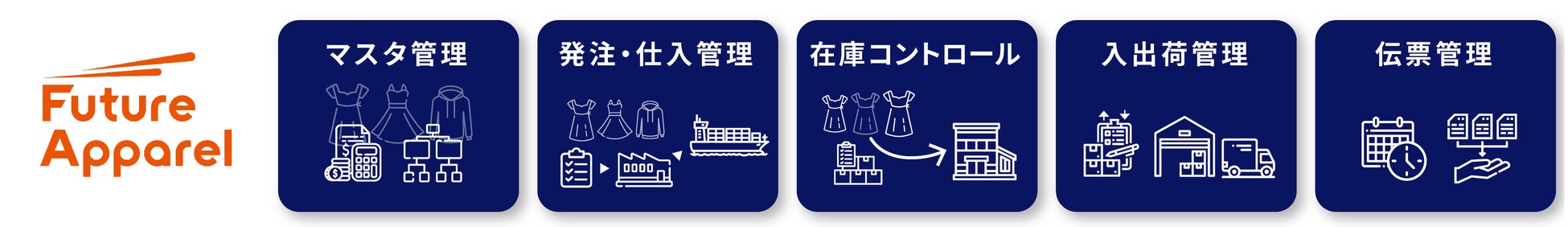 マスタ管理、発注・仕入管理、在庫コントロール、入出荷管理、伝票管理といったアパレル業界の主要業務を