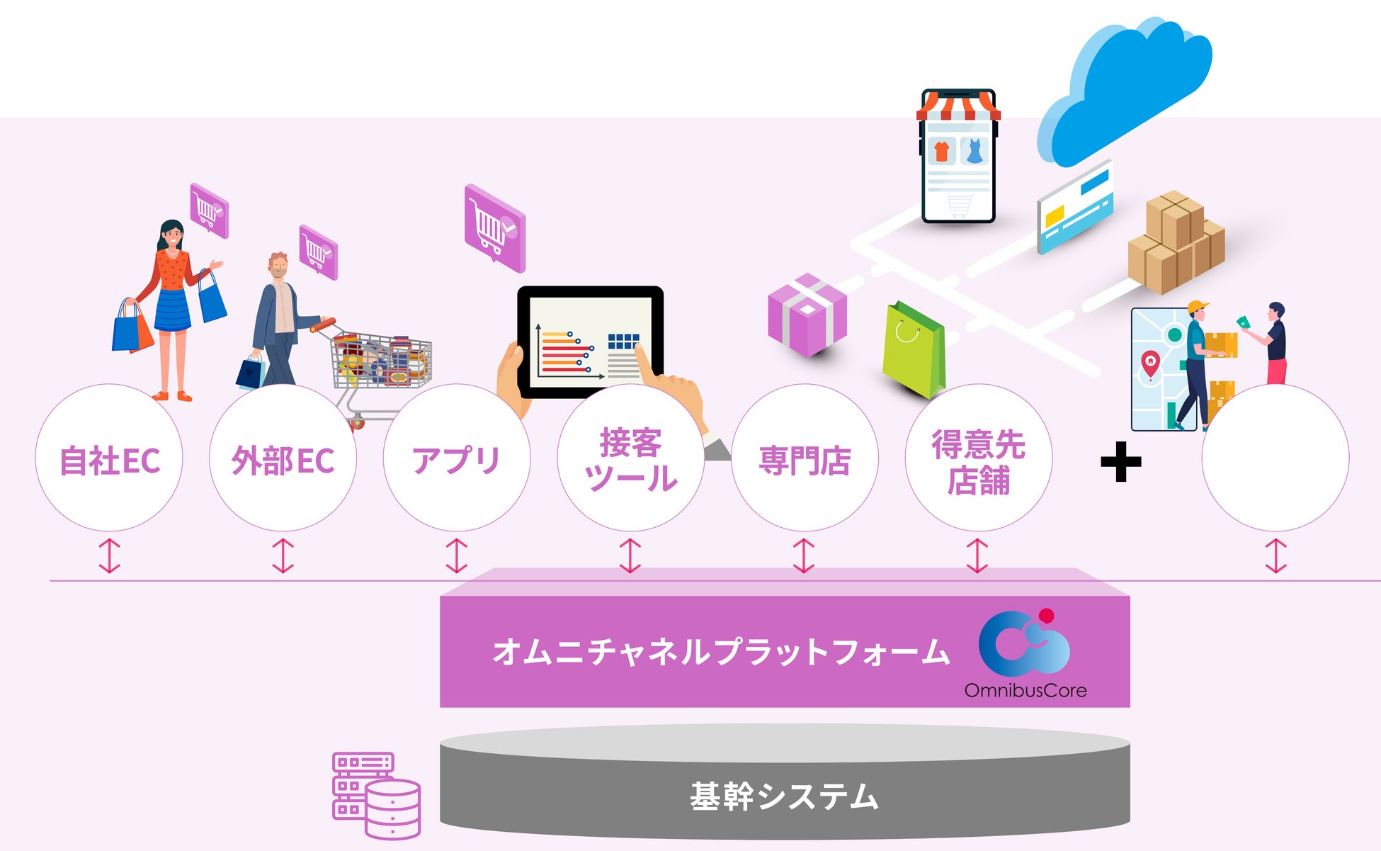 商品・在庫をはじめとしたチャネル横断で一元化すべき情報をハブとなりシームレスに連係。運用負荷や販売機会の損失を低減することで最適なチャネル展開に寄与。