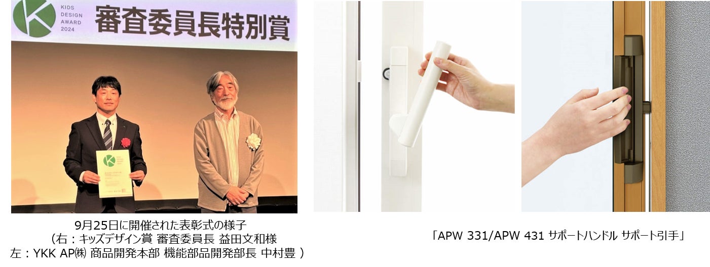 YKK AP株式会社(本社:東京都千代田区、社長:魚津 彰)の、窓の開閉操作の負荷を低減するオプション部品「APW 331/APW 431 サポートハンドル サポート引手」が、「第18回 キッズデザイン賞」(主催:特定非営利活動法人キッズデザイン協議会、後援:経済産業省、内閣府、消費者庁、こども家庭庁)において、上位賞である特別賞「審査委員長特別賞」を受賞しましたのでお知らせします。