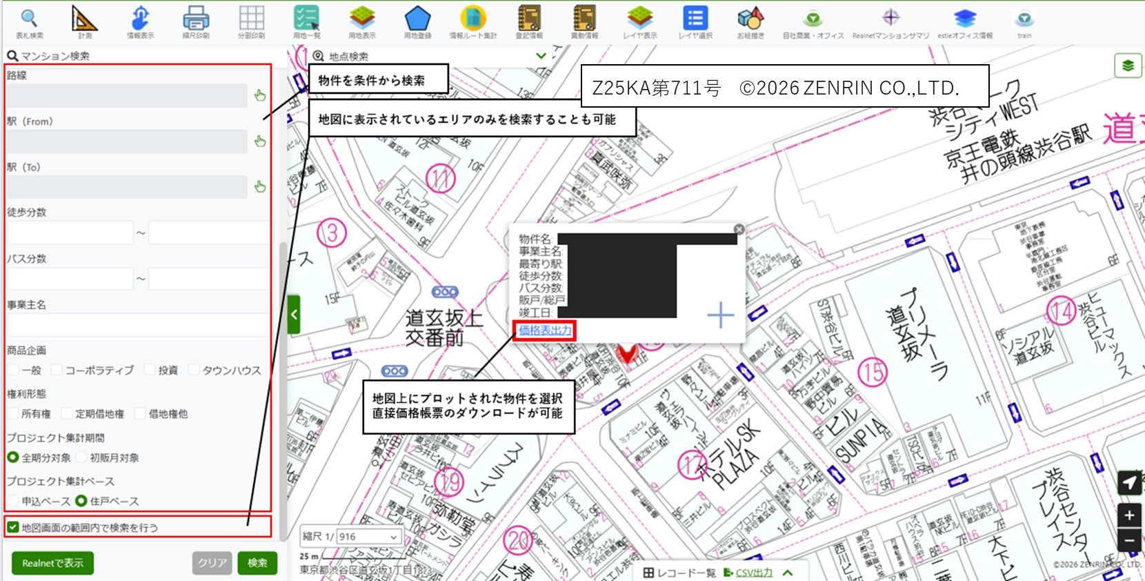 株式会社マーキュリーが提供する分譲マンション供給データとのAPI連携を強化し、分譲マンションの詳細な価格帳票を地図上から直接ダウンロードできる機能を追加いたしました。これまで別システムでの個別アクセスが必要だった価格情報の取得がワンストップ化されることでより効率的な業務推進が可能となります。