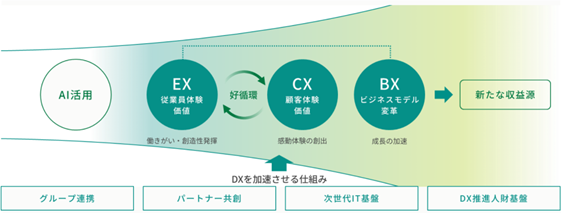 DX ビジョンに基づき、働きがいを実感する従業員による質の高いサービスが、お客さまの感動体験を生み、さらに従業員のモチベーションを向上させるような EX と CX の好循環につなげていきます。積極的な AI 活用を起点としたこのサイクルを、グループ連携やパートナー共創、DX 推進を支える基盤の強化によって加速させ、ビジネスモデル変革とその先の新たな収益源の獲得を実現することが DX による価値創造を考えております。