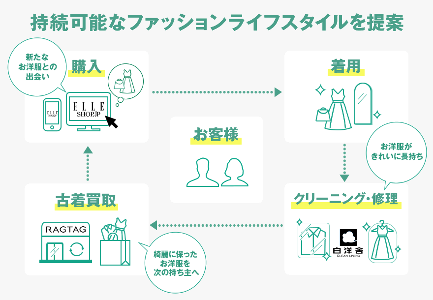 ファッションEコマースの『ELLE SHOP』、クリーニングの白洋舍、ブランド古着買取のラグタグは、お気に入りの洋服をクリーニングサービスでメンテナンスすることで、洋服を清潔に保ち、長く愛用し、着られなくなった洋服は再販して新たな持ち主のもとで再び愛用されることで、洋服の廃棄を減らし、持続可能なファッションを実現する「スローワードローブ」を推進しています。