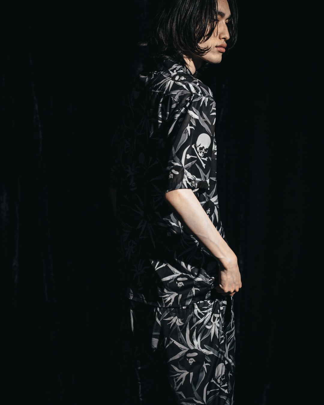 「TROPICAL SKULL CAMO RELAXED FIT SHORTS」は、同じく「TROPICAL SKULL CAMO」を採用した総柄のショーツです。シャツと同素材のサテン生地を使用しており、セットアップとしてもご着用いただけます。