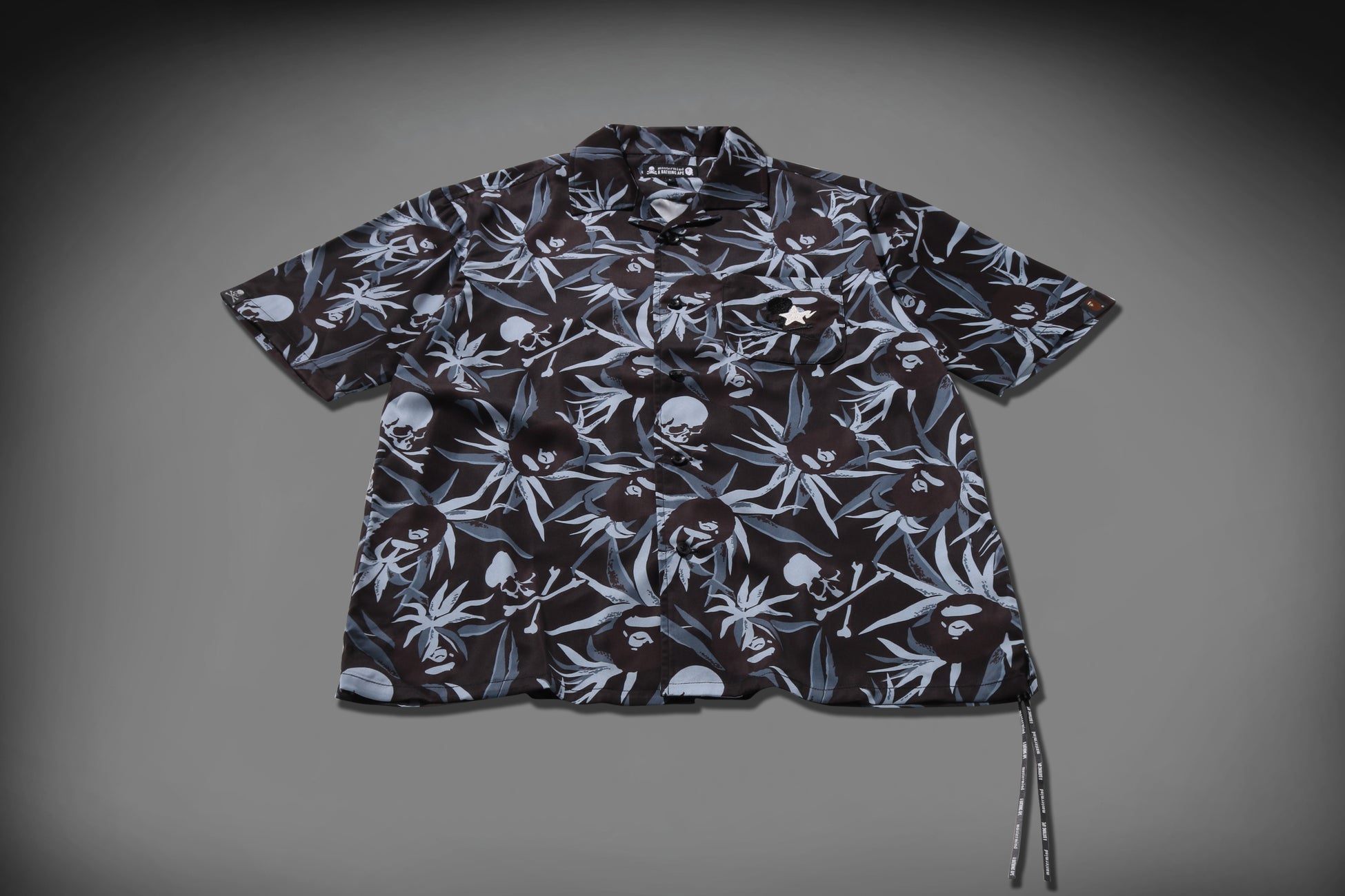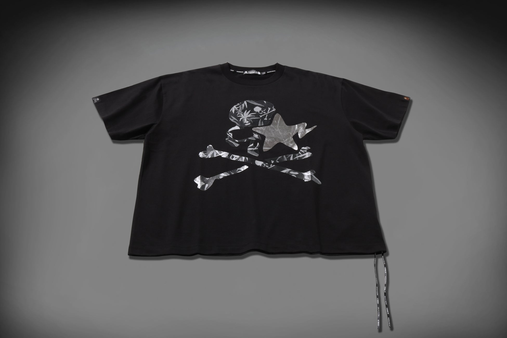 『MM BAPE® LOGO TROPICAL SKULL CAMO RELAXED FIT TEE』は、「TROPICAL SKULL CAMO」のグラフィックをSKULLモチーフに落とし込み、STAのロゴを箔押しで表現した一着。リラックスフィットで、左裾には同様にレザーストラップが付属します。