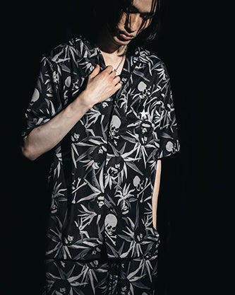 「TROPICAL SKULL CAMO OPEN COLLAR SS SHIRTS」は、「TROPICAL SKULL CAMO」を全面にあしらった総柄のショートスリーブシャツです。シャイニーなサテン素材を採用し、オープンカラー仕様にすることで、軽やかで涼しげな印象に仕上げました。左裾にはレザーストラップが付属します。