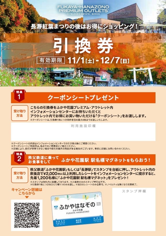 ■参加方法:「長瀞紅葉まつり」の対象4施設に設置・配布している引換券をふかや花園プレミアム・アウトレット内インフォメーションセンターへお持ちください。
