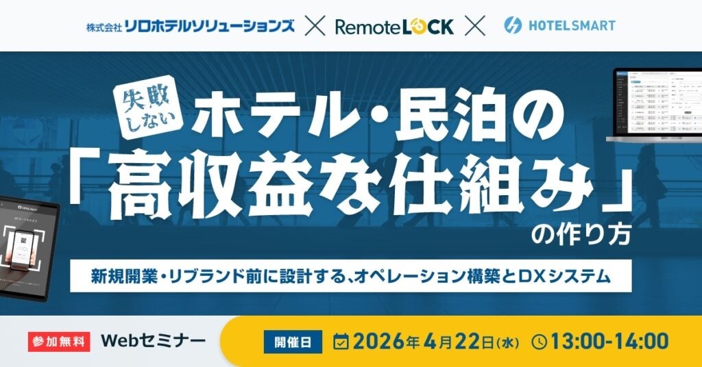 会員制リゾート事業、ホテル・旅館運営再生事業を担う「株式会社リロバケーションズ」が2024年3月に設立した子会社「株式会社リロホテルソリューションズ(所在地:東京都新宿区新宿、代表取締役社長 島田康平)」は、ホテル・旅館業界の課題解決のため、スマートロックを提供する株式会社リモートロックジャパンとホテル管理システム<HOTEL SMART>を提供する「xxx(エイジィ)株式会社」との3社共同で、2026年4月22日(水)「失敗しないホテル・民泊の“高収益な仕組み”の作り方」をテーマとした無料ウェビナーを開催します。