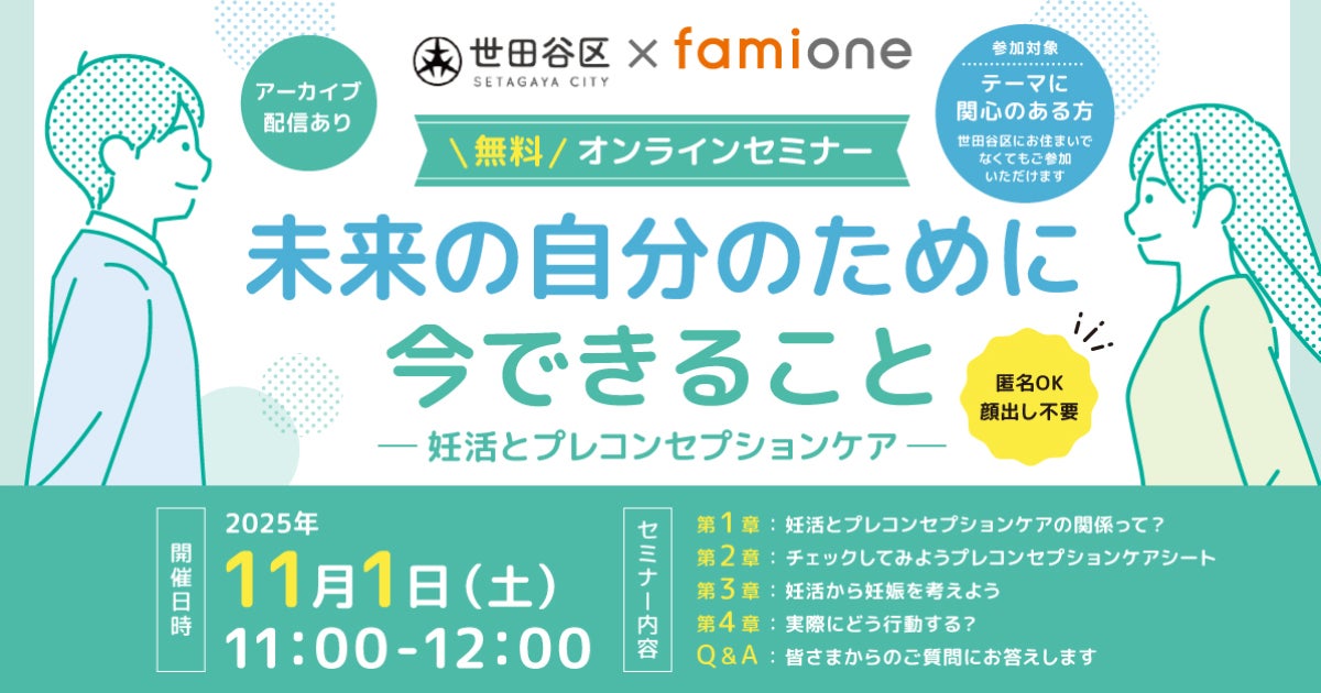 「子どもを願うすべての人によりそい 幸せな人生を歩める社会をつくる」をビジョンに掲げ、法人の従業員向け福利厚生や自治体の住民向け支援を行うヘルスケアサポートサービス「ファミワン」 https://famione.com/benefit/などを展開する株式会社ファミワン(本社:東京都渋谷区、代表取締役:石川勇介)は、令和4年度から継続して提供している東京都世田谷区(区長:保坂 展人、以下 世田谷区)の「妊活オンライン相談事業」の一環として、無料オンライン講演会「未来の自分のために今できることー妊活とプレコンセプションケアー」を2025年11月1日(土)に開催します。