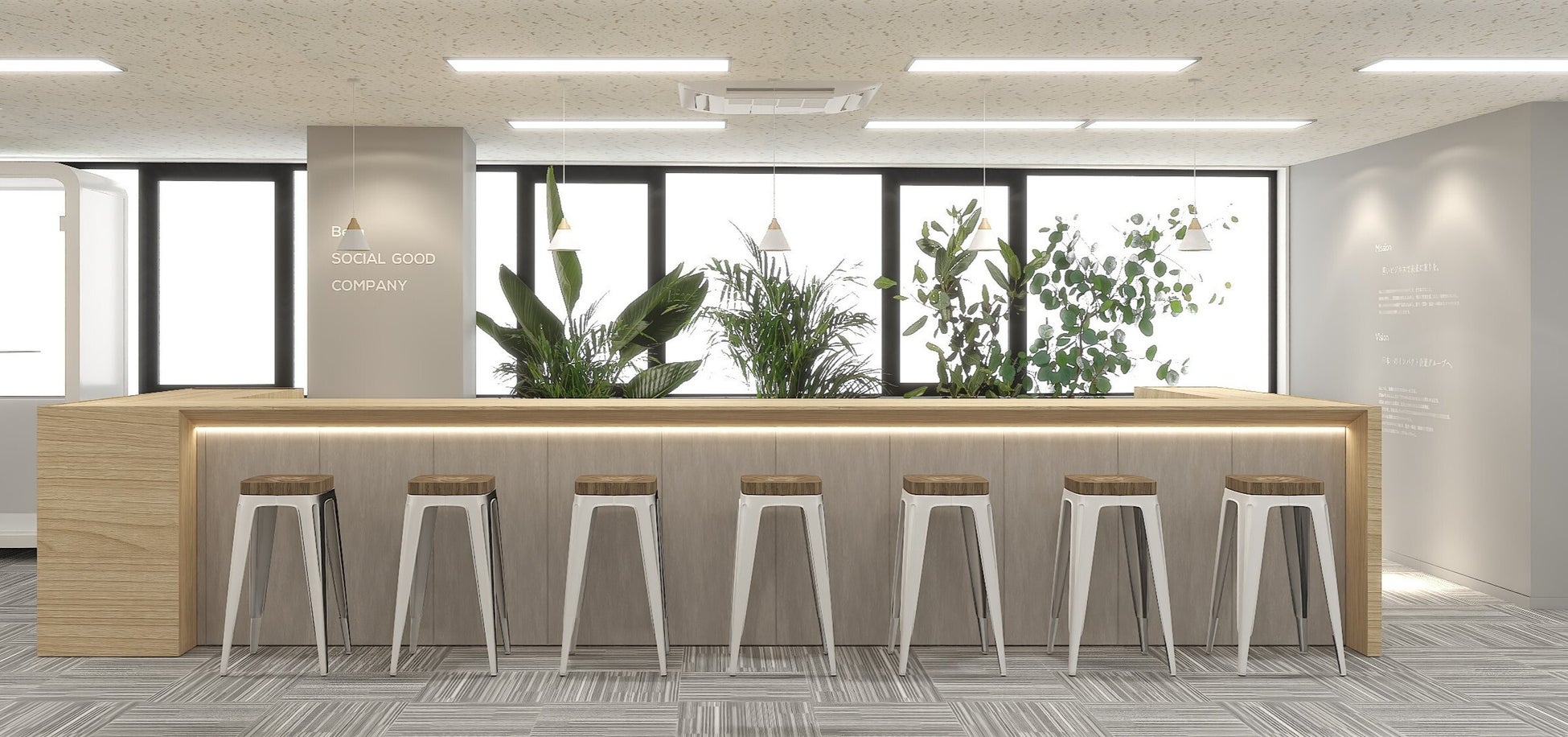 コーポレートアイデンティティ刷新に伴い、「成長・拡大を支える社員の働きやすさ」をテーマにオフィスを刷新しました。社員が新たなアイデンティティを意識し、互いに協力しながら未来への挑戦を加速させていけるよう、新ロゴやミッション・ビジョンを象徴的に配置し、五感に響く設備を整えることで快適な空間を構築いたしました。