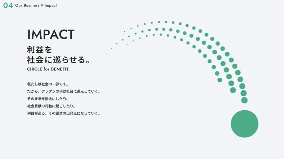 クラダシは、これまで「サステナビリティ」と定義してきた、これら2つの事業を通じて創出される社会価値を、新たに「Impact(インパクト)」と定義し、その最大化を全体のコアに据えています。