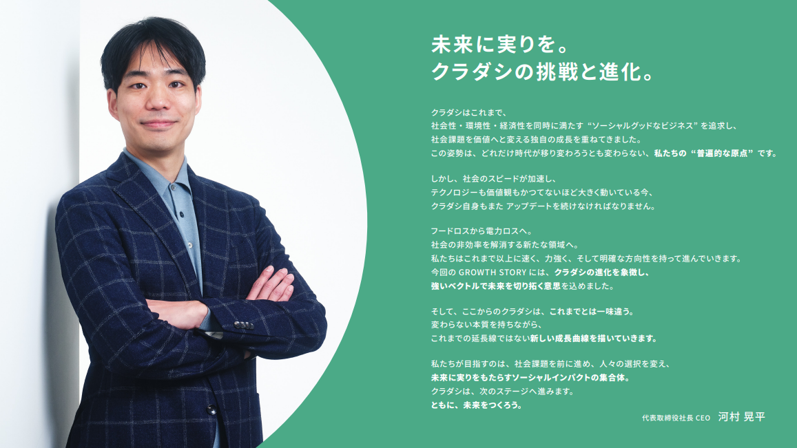 これまでの「点(Social good)」としての善いビジネスを、社会全体へインパクトを与える「面(Social growth)」へと昇華させ、新たなアイデンティティとともに、クラダシは「日本一のインパクト企業グループ」を目指し、より良い社会の実現に向けた歩みを加速させてまいります。
