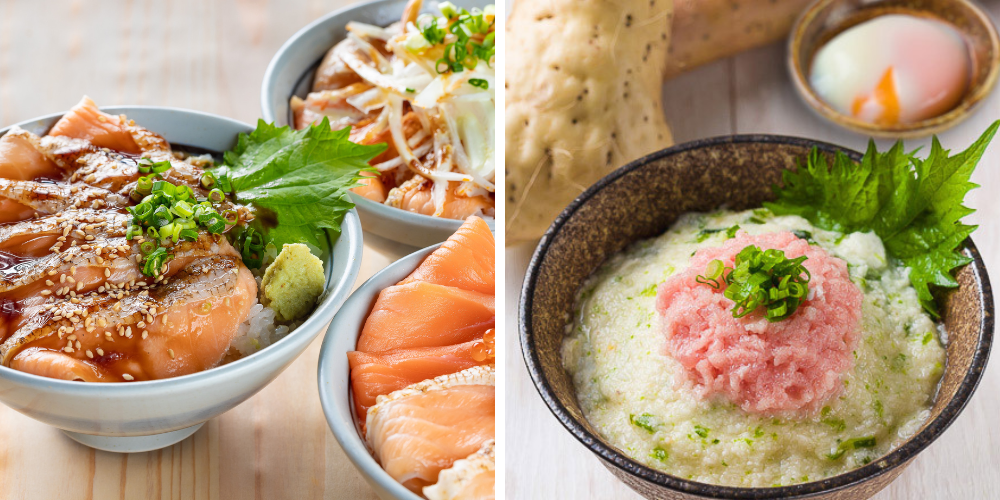 ・【ネギトロ・甘エビ・サーモンたたき】 とろける温玉3色丼 1,290円~ (写真・右)