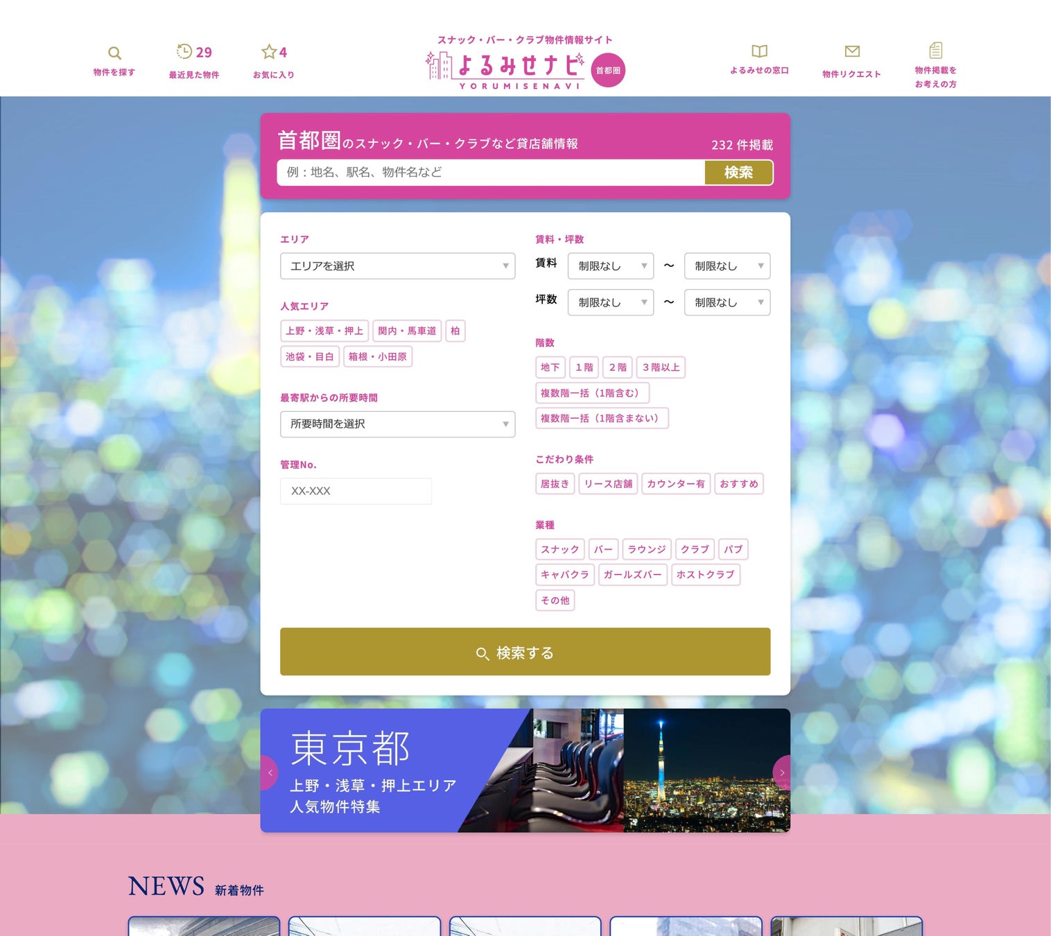 店舗経営者の若返りが進んでいる昨今、開業を希望する方は、物件をウェブサイトで検索しています。「よるみせナビ」では、 フリーワード検索のほか、立地や賃料・坪数といった基本検索をはじめ、物件ごとのお勧め店舗業態、カウンターのあり/なしや、居抜きかリース店舗かなど、開業したいお店のイメージに沿った物件を素早く検索することが可能です。