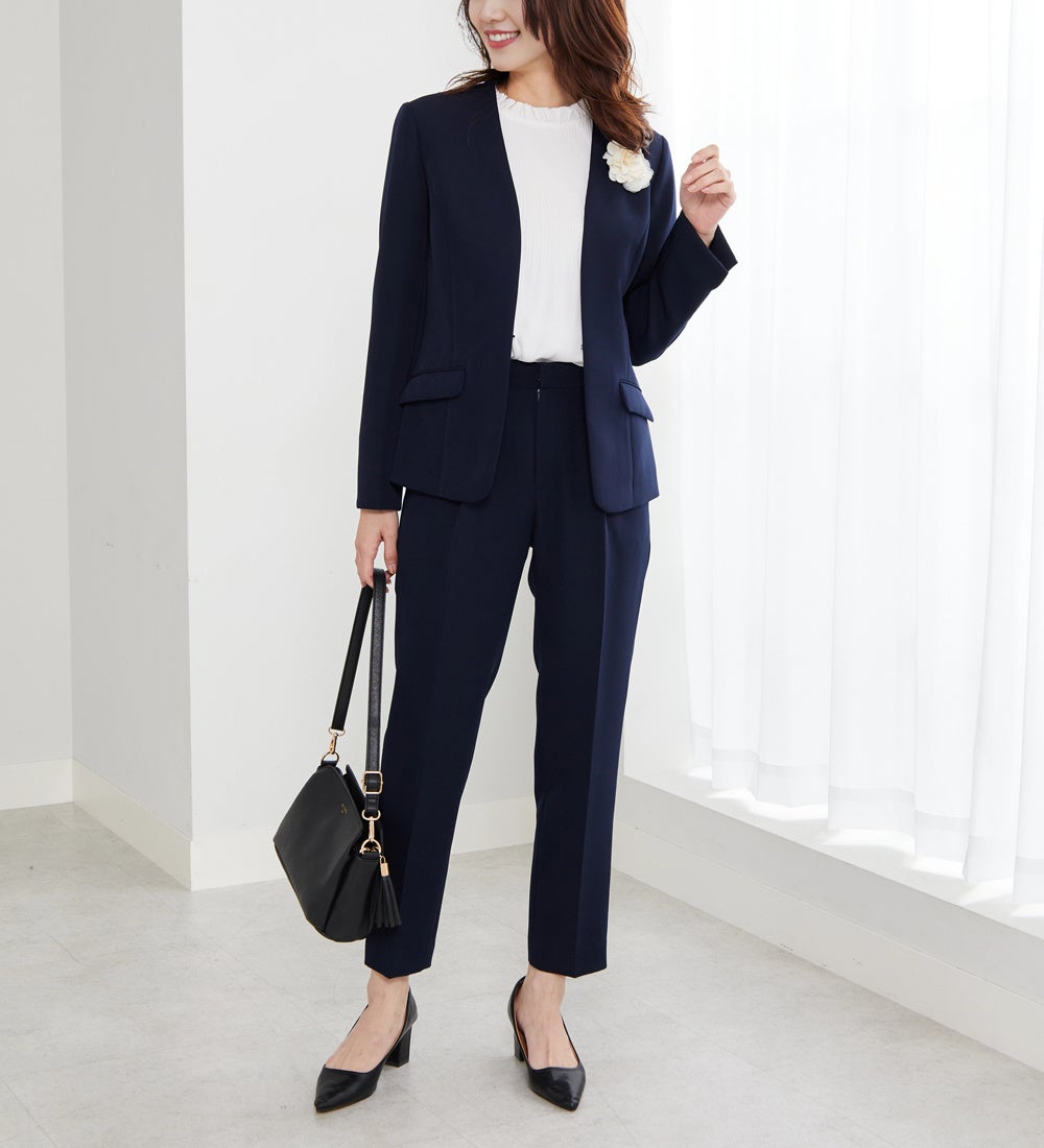 ■特長:シンプルで洗練されたノーカラージャケット。首元をすっきり見せるノーカラーデザインは、ボウタイブラウスやレースインナーなど華やかなトップスとも、テーパードパンツやワイドパンツといったきちんと感のあるボトムスとも相性が良く、着回し力の高い一着です。